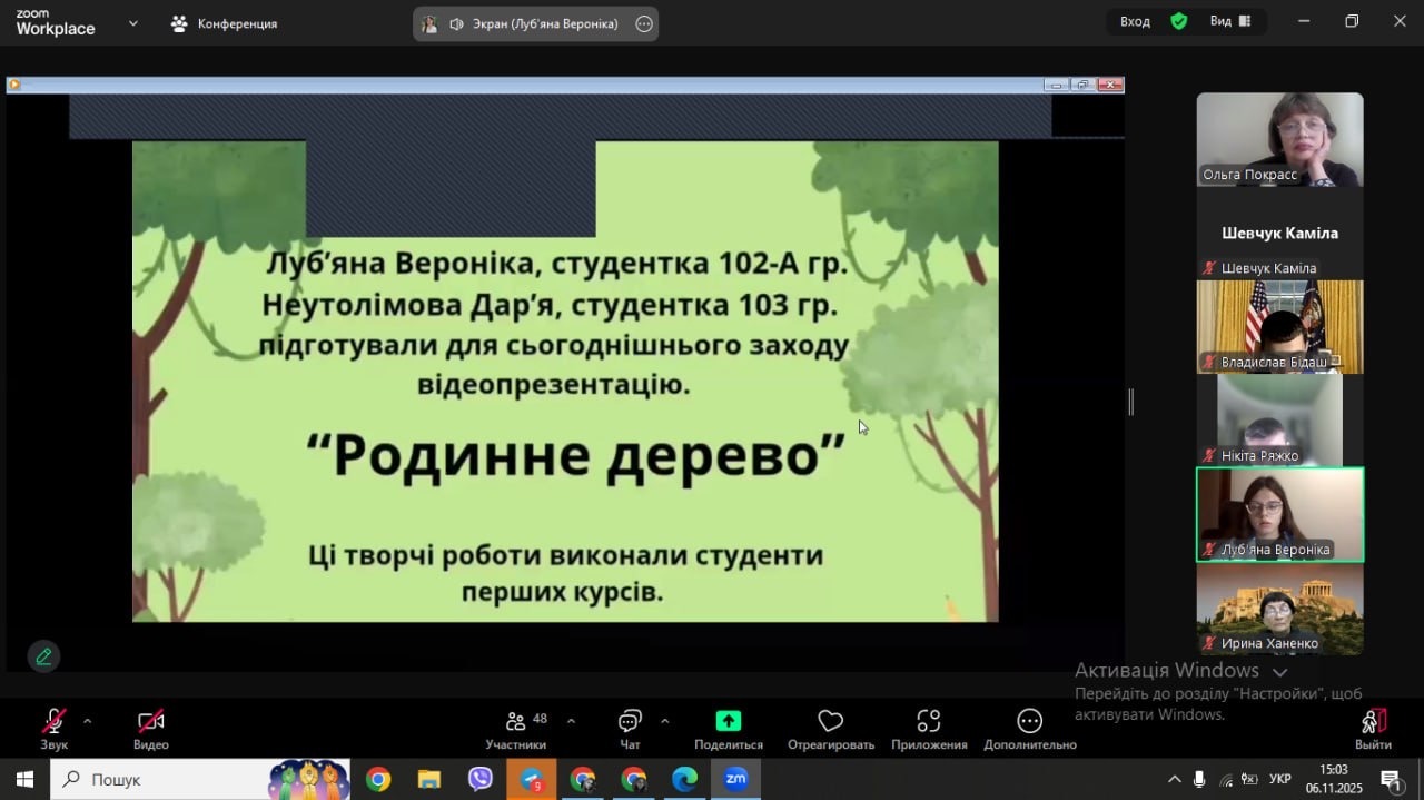 Студенти першого курсу підготували свої варіанти відповіді на питання про те, хто ми є, як ми себе бачимо і до якої спільноти себе відносимо, тобто про національну ідентичність. Основними напрямками міні-досліджень були: «Родинне дерево» – «…без роду-племені, його благословення, не можна праведно на цій землі прожить». Роботу представили студенти групи 102-А Лубьяна Вероніка і групи 103 Неутолімова Даша.
