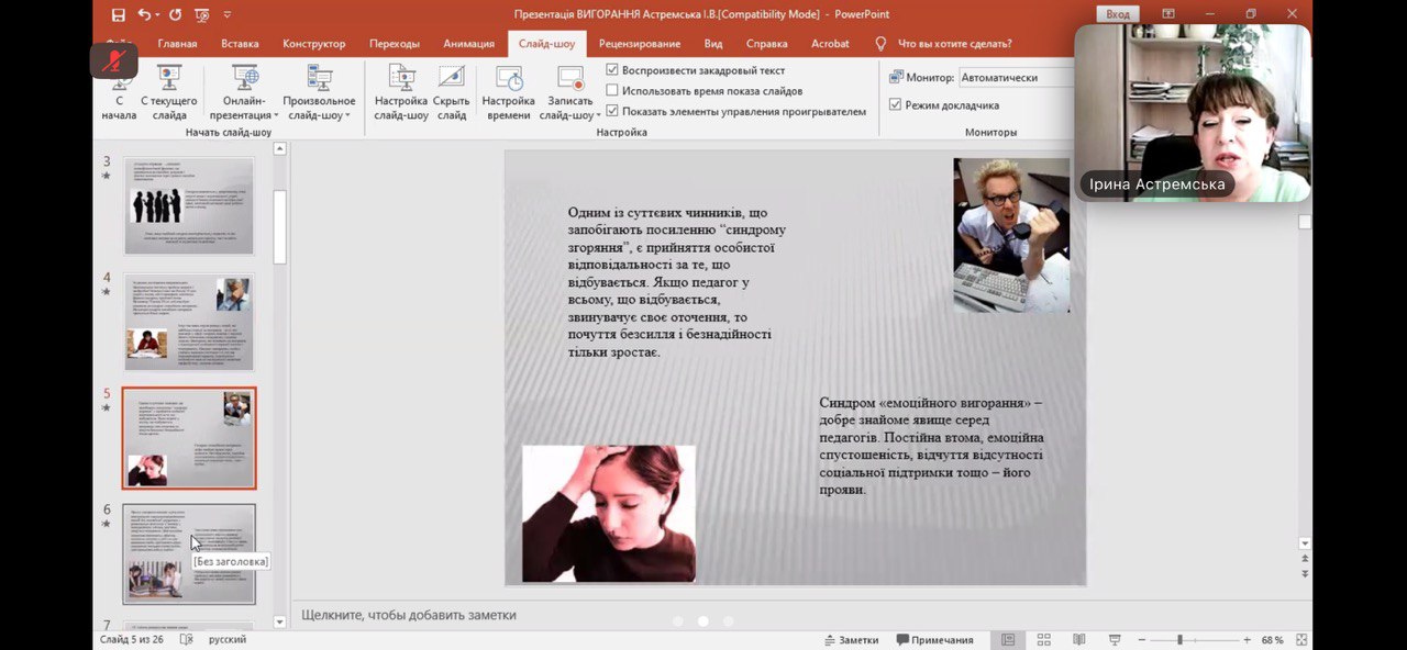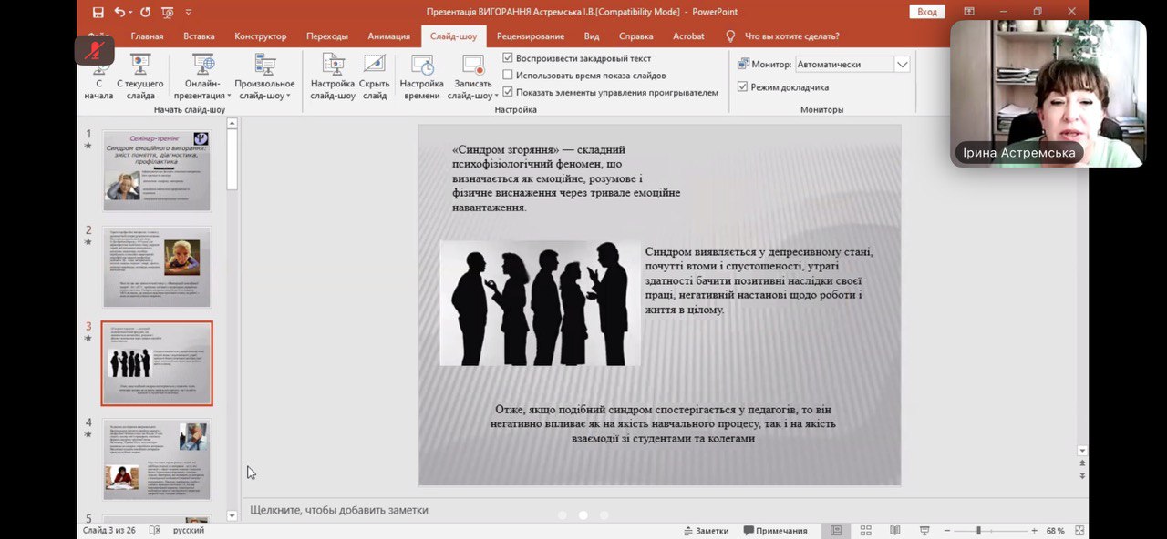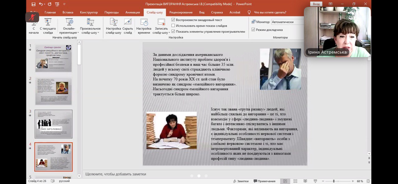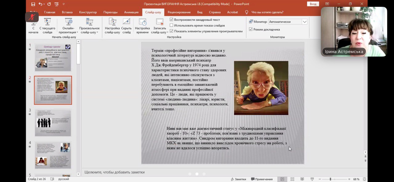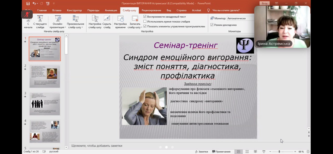 Доктор психологічних наук в.о. професора кафедри психології Чорноморського національного університету імені Петра Могили Астремська Ірина Володимирівна провела розмову на тему «Профілактика та подолання синдрому «емоційного вигорання». Присутні були ознайомлені з феноменом «емоційного вигорання», його причинами та наслідками. Бажаючі могли пройти діагностику синдрому «вигорання» та тестування на самооцінку стійкості до стресу. Були також визначені шляхи його профілактики та подолання, опанування антистресовими техніками.