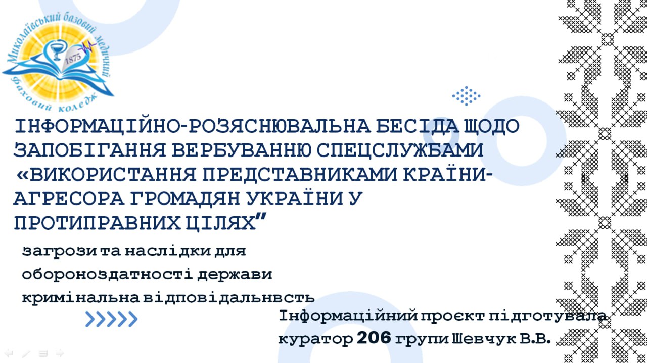 Інформаційно-роз’яснювальна бесіда щодо запобігання вербуванню спецслужбами В умовах війни Росія активно використовує інформаційні, психологічні та агентурні методи впливу, щоб залучити…