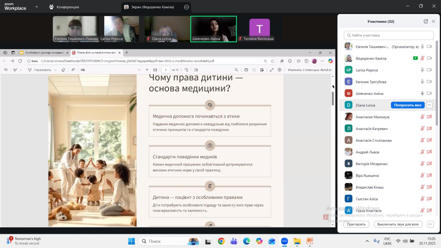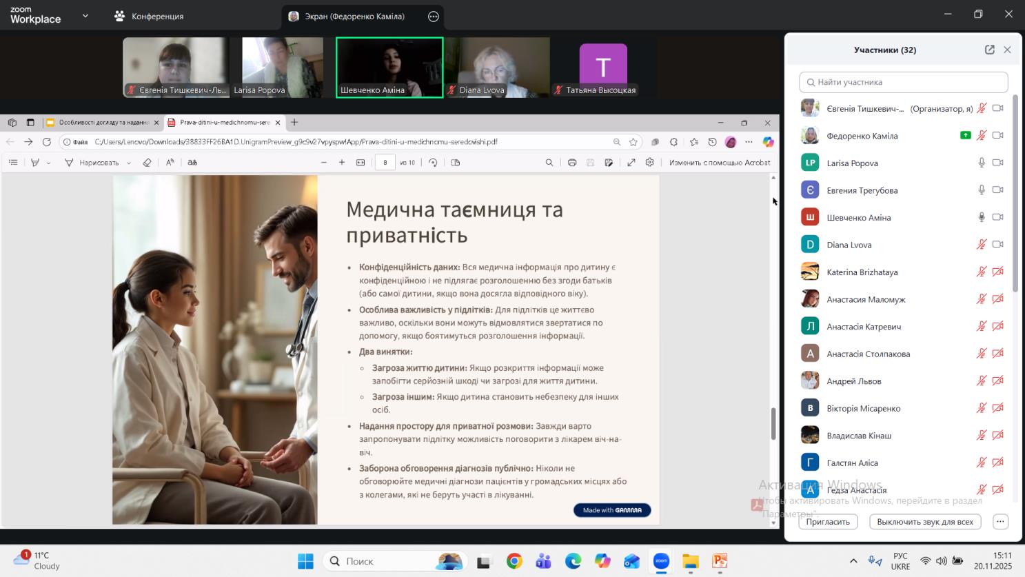 20 листопада, відбувся Інформаційний гайд «Майбутнє у наших руках», присвячений Міжнародному дню дітини під керівництвом викладача Тишкевич-Львової Євгенії Василівни. Захід став надзвичайно важливою та своєчасною подією для студентів, які обрали сестринську справу. Цей захід ефективно розпочав декаду циклової комісії педіатричних, акушерських та вузьких дисциплін, задавши високий стандарт міждисциплінарного підходу. Його ключовою перевагою стала динамічна інтерактивність – від вікторини «Правда чи міф», що стимулювала критичне мислення, до «Відкритого мікрофону», який забезпечив простір для обговорення складних клінічних та етичних питань. Доповіді та презентації спікерів студентів 403 групи, охопили не лише суто медичні аспекти (наприклад, АФО органів та систем дитини або особливості невідкладної допомоги), а й забезпечили майбутніх медиків цілісними компетенціями, інтегруючи медичні, етико-правові та психологічні аспекти догляду за дитиною.