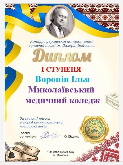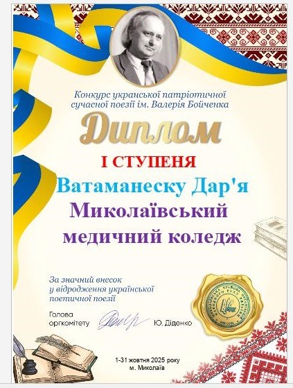 Дипломами І ступеня в Конкурсі відзначено здобувачів освіти Миколаївського базового медичного фахового коледжу за ОПП “Сестринська справа” Ватаманеску Дар’ю (студентка 203 групи) і Вороніна Іллю (студент 306 групи). Це важливе досягнення, що свідчить про високу майстерність, глибоке розуміння слова та справжній патріотизм.
